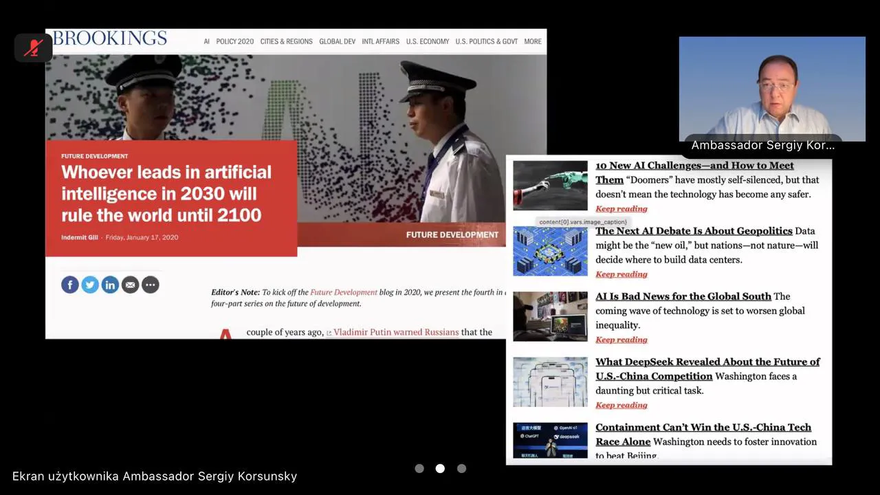 Окрему увагу доповідач приділив етичним викликам, змаганню технологічних лідерів (США, Китаю та ЄС) і рольовим змінам у міжнародній системі, які зумовлені стрімким розвитком цифрових технологій. За словами Корсунського, майбутнє міжнародних відносин значною мірою залежить від того, наскільки ефективно держави зможуть поєднати технологічні інновації з демократичними цінностями та безпекою людини.