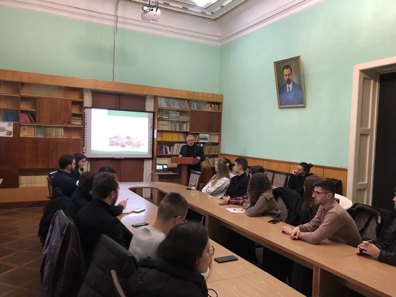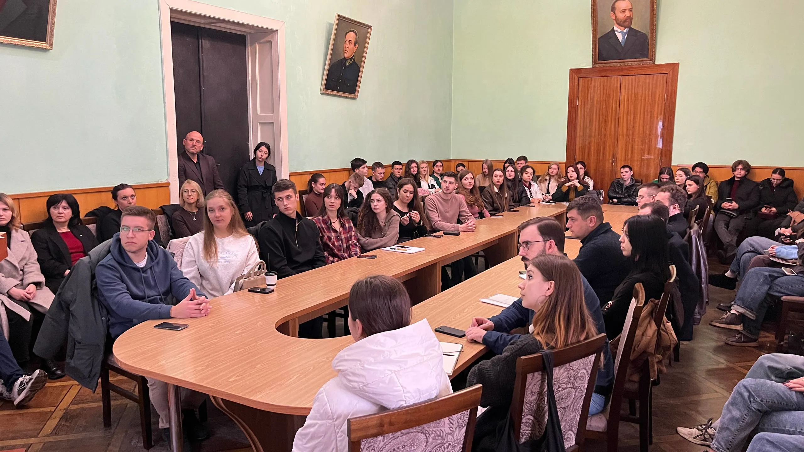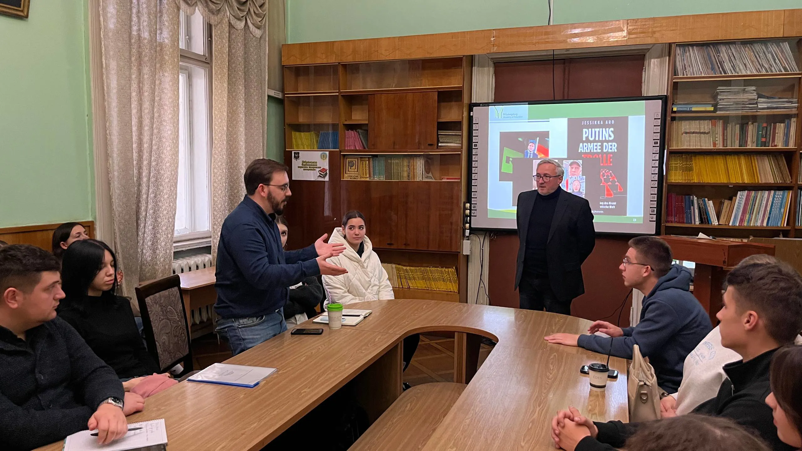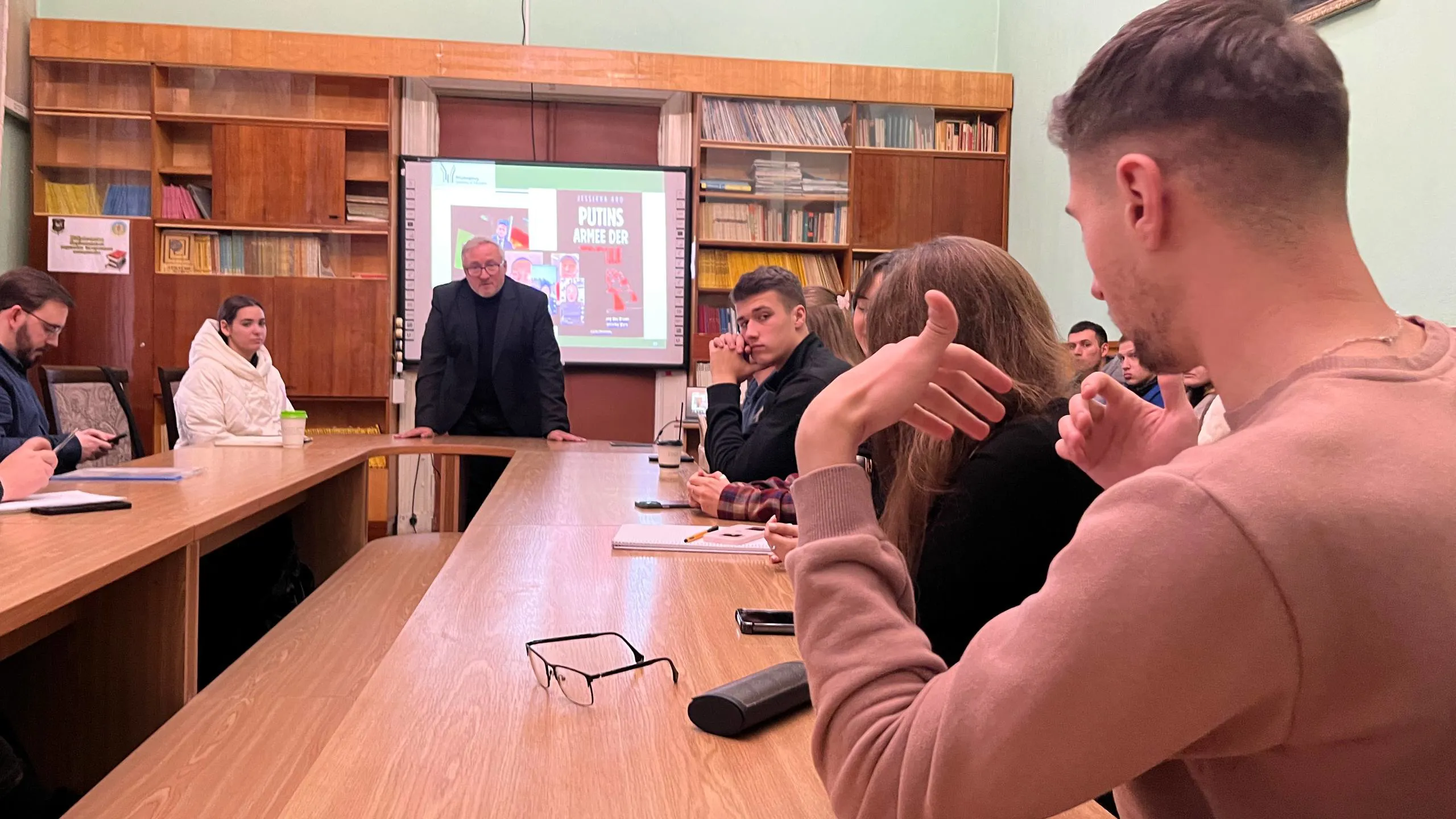 Міжнародне партнерство в умовах війни – це про людиноцентричність. Про підтримку на всіх рівнях: від гуманітарної допомоги до освітньої співпраці. Тобіас Аранд, професор історії Педагогічного університету Людвіґсбурга, Німеччина, активно організовує збір гуманітарної допомоги українцям упродовж всіх років широкомасштабної війни. Одночасно він щороку приїжджає до ЧНУ імені Юрія Федьковича з лекціями, що їх вже традиційно читає для студентів та аспірантів факультету історії, політології та міжнародних відносин. Цьогоріч його лекція, проведена у рамках науково-методичного семінару для аспірантів ОНП «Політологія» (гарант професор Наталія Ротар) та «Історія та археологія» (гарант професор Олександр Добржанський), була присвячена митцям та письменникам у сучасній війні. До участі були запрошені магістри та бакалаври різних освітніх програм факультету. Модерувала захід доцент кафедри політології та державного управління Наталія Юрійчук.